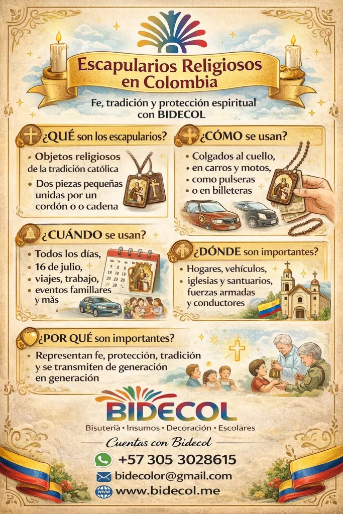 En BIDECOL Colombia entendemos que los escapularios no son solo accesorios religiosos, sino símbolos profundos de fe, devoción y protección espiritual que acompañan a los colombianos en su vida diaria.