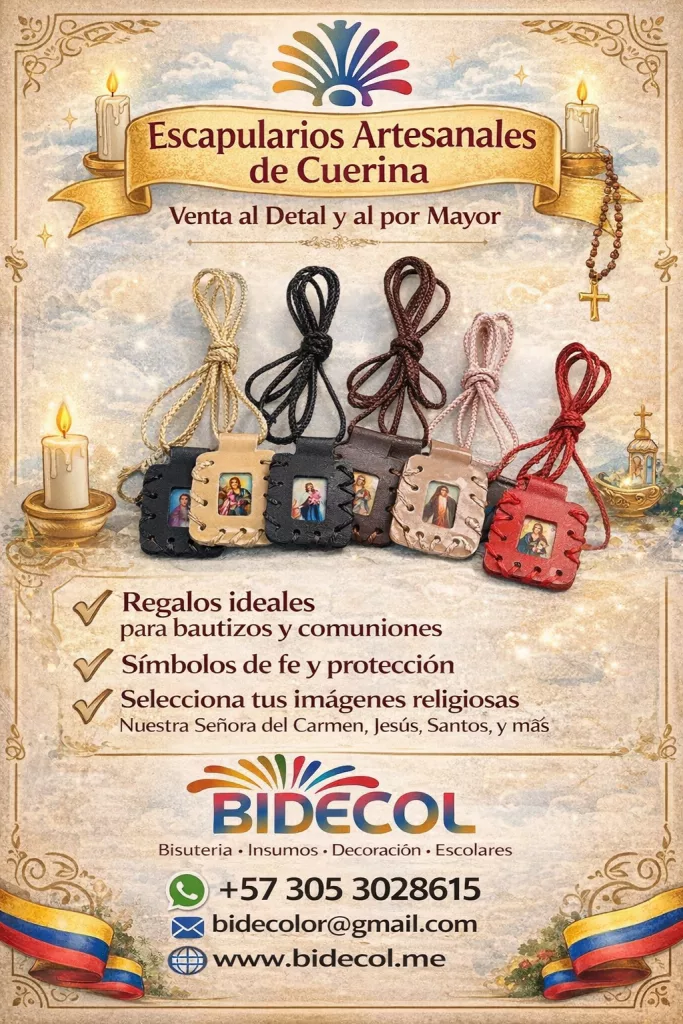 En BIDECOL Colombia, los escapularios católicos son piezas esenciales para la bisutería religiosa y las manualidades, ya que representan fe, tradición y protección espiritual profundamente arraigadas en la cultura colombiana. Estos escapularios se usan a diario, en el hogar, en el trabajo y durante los viajes, así como en momentos especiales como bautizos, comuniones y celebraciones religiosas, convirtiéndose en accesorios y regalos de alto valor simbólico. Se utilizan principalmente colgados al cuello, en pulseras, llaveros o accesorios artesanales, lo que los hace ideales para creadores, emprendedores y artesanos. Son importantes porque conectan la devoción católica con el diseño artesanal, permitiendo crear productos personalizados y significativos que fortalecen la identidad cultural y religiosa. En BIDECOL ofrecemos escapularios para bisutería y manualidades, pensados para el mercado colombiano, con disponibilidad para venta al detal y al por mayor, apoyando proyectos creativos y comerciales en todo el país.