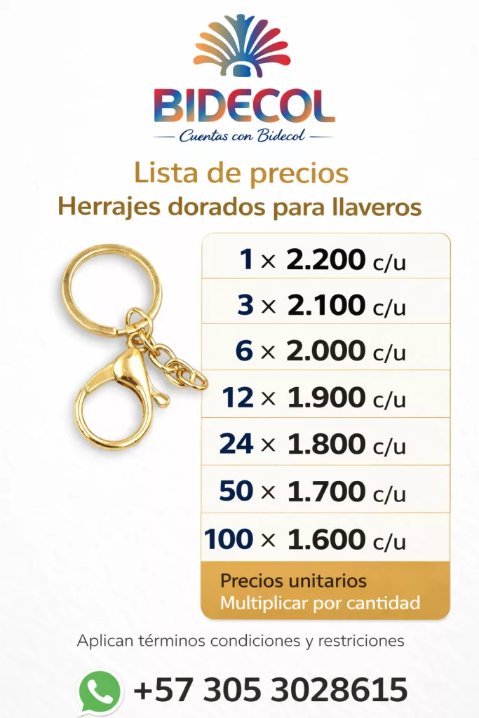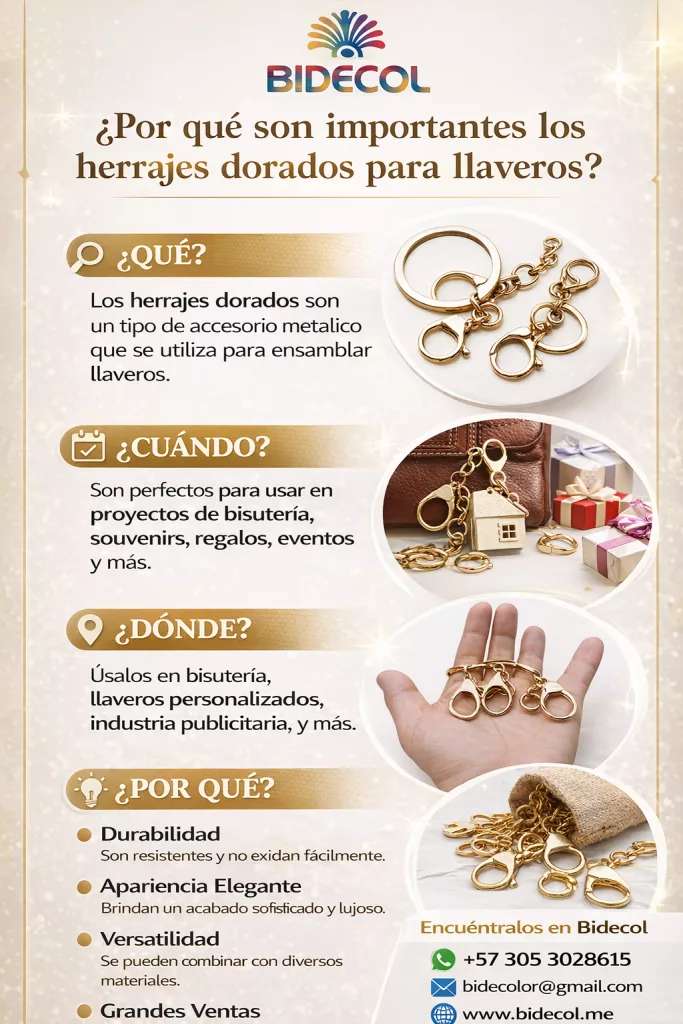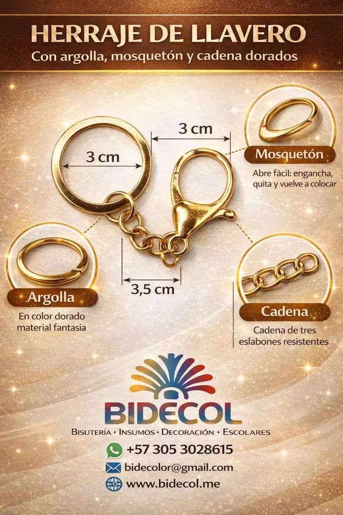 Herrajes dorados para llaveros con argolla, mosquetón y cadena, ideales para la elaboración de llaveros personalizados, bisutería, souvenirs y accesorios de moda; este herraje metálico de alta calidad ofrece resistencia, brillo y un acabado profesional que mejora la presentación de cualquier creación artesanal o comercial, siendo perfecto para emprendedores, diseñadores y marcas que buscan insumos confiables para fabricar llaveros y productos personalizados en Colombia con el respaldo de BIDECOL.