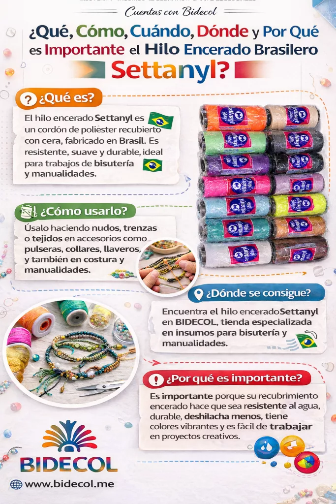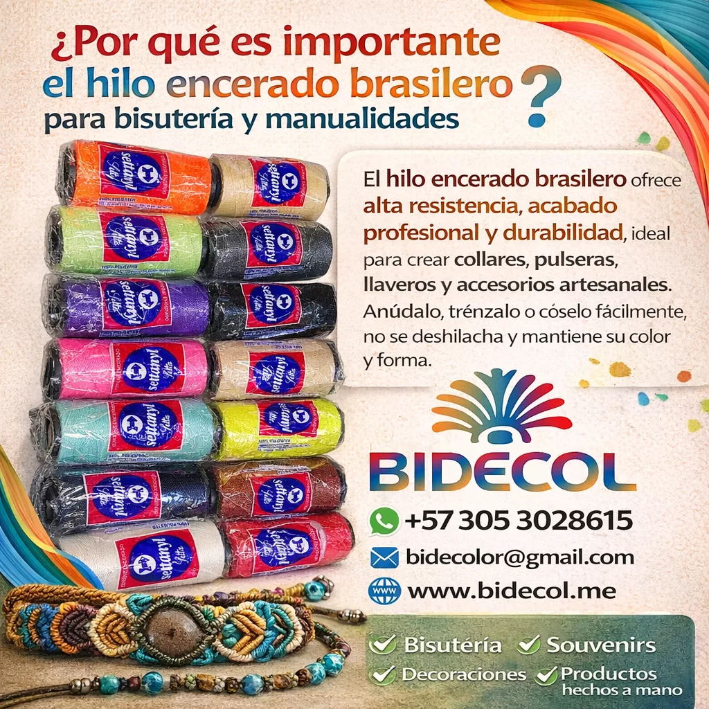El hilo encerado brasilero para bisutería y manualidades es un insumo esencial porque ofrece alta resistencia, acabado profesional y durabilidad, siendo ideal para crear collares, pulseras, llaveros, macramé y todo tipo de accesorios artesanales; qué es: un hilo de poliéster recubierto de cera que no se deshilacha y mantiene su forma, cómo se usa: se anuda, se trenza o se cose fácilmente sin romperse ni perder color, cuándo se utiliza: en proyectos que requieren firmeza, estética y larga vida útil, dónde se aplica: en bisutería, joyería artesanal, marroquinería, souvenirs, decoraciones y productos hechos a mano, y por qué es importante: porque garantiza acabados limpios, nudos seguros y piezas más resistentes al uso diario, la humedad y el desgaste, lo que lo convierte en el hilo preferido por artesanos, diseñadores y marcas que buscan calidad profesional en sus creaciones.