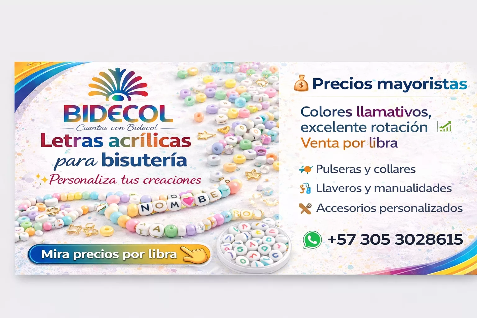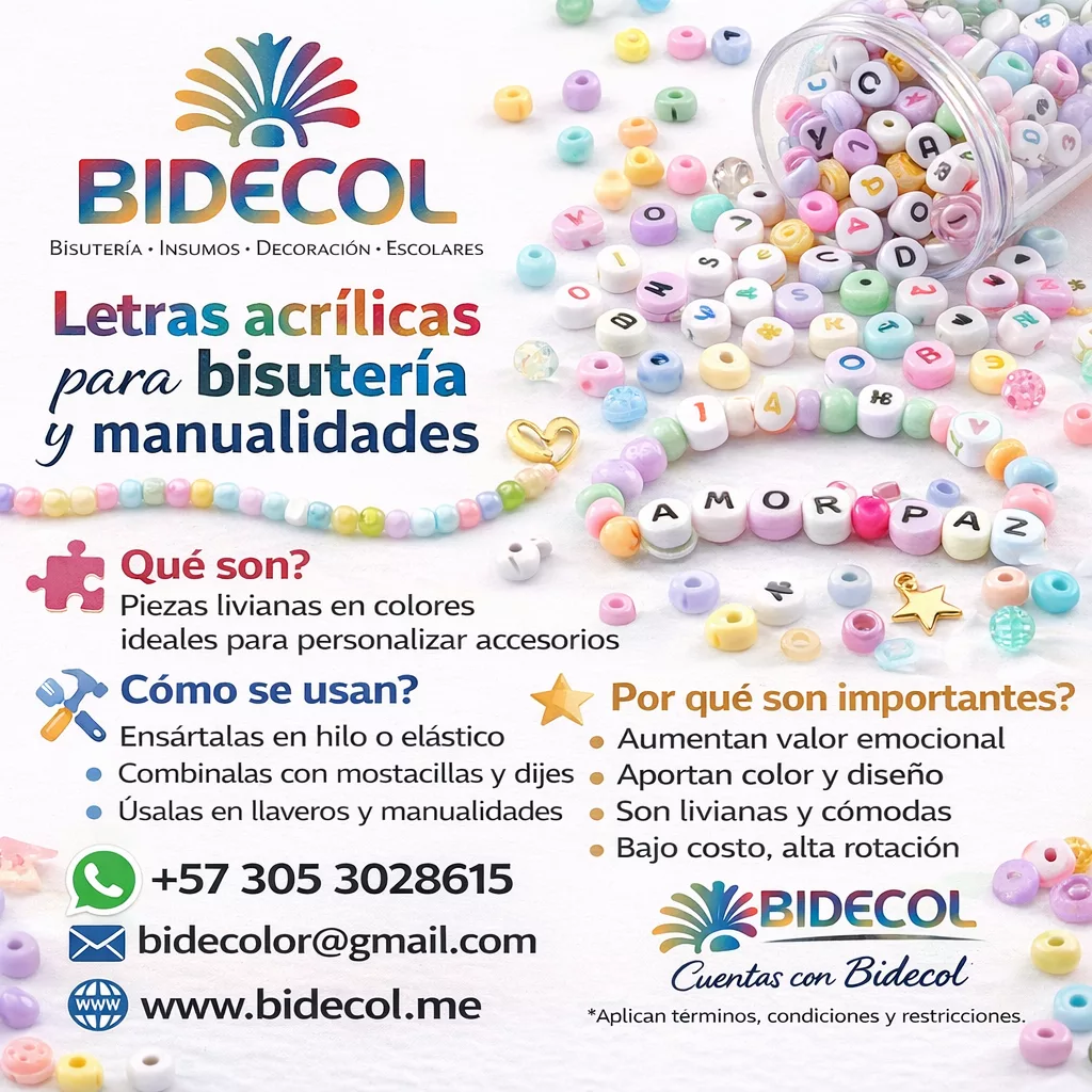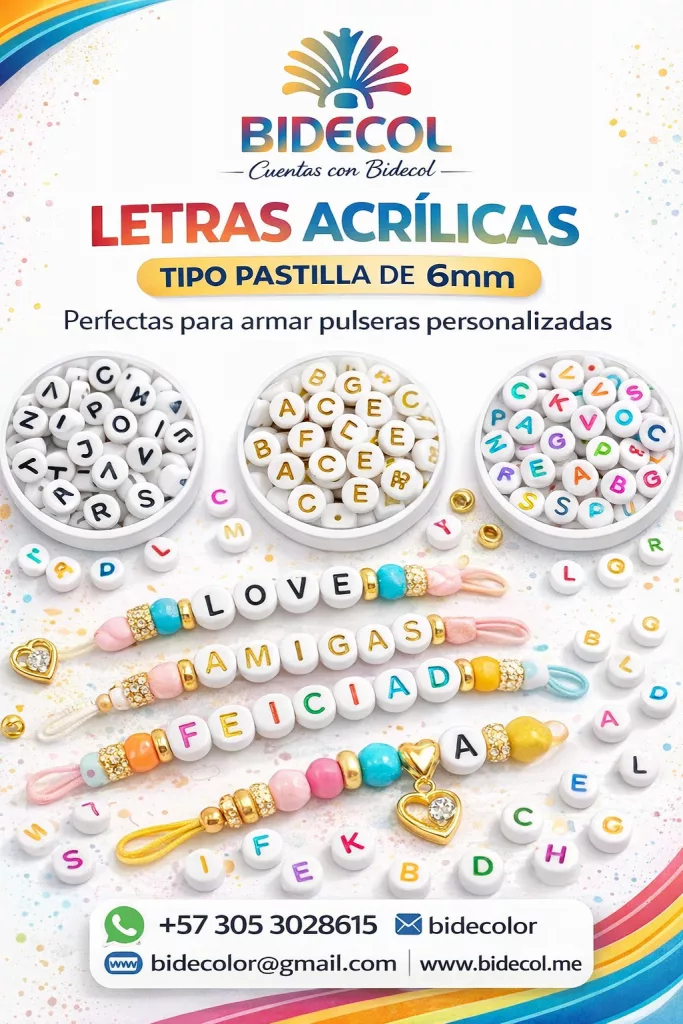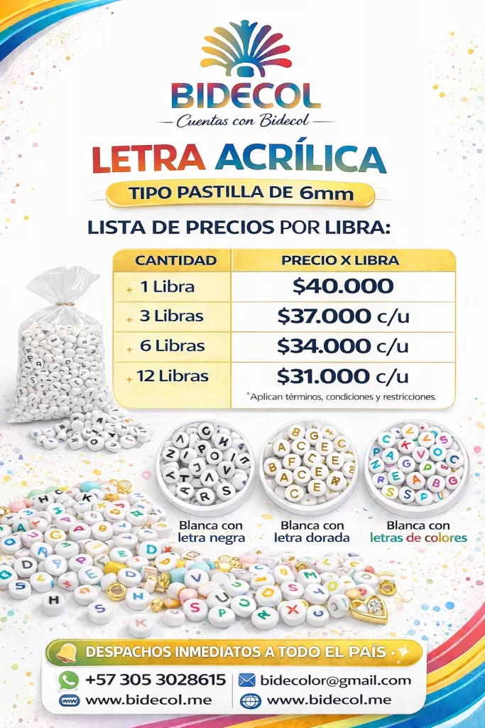 En BIDECOL Colombia ofrecemos letras acrílicas tipo pastilla de 6 mm para bisutería y manualidades, ideales para crear pulseras personalizadas, collares, llaveros y accesorios creativos con alto valor comercial y excelente rotación; nuestras letras acrílicas destacan por sus colores llamativos, acabado de calidad y facilidad de uso, y están disponibles en blanca con letra negra, blanca con letra dorada y blanca con letras de colores, con venta por libra a precios mayoristas, atención personalizada y despachos inmediatos a todo el país, convirtiéndonos en un proveedor confiable de insumos para bisutería en Colombia para emprendedores, talleres y marcas artesanales que buscan rentabilidad y abastecimiento constante.