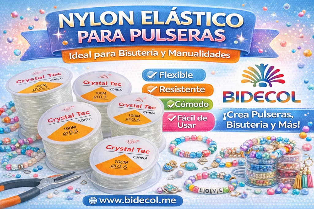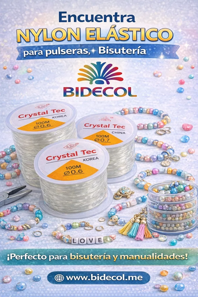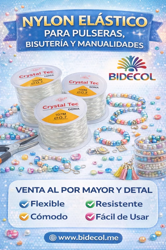 El nylon elástico para pulseras, bisutería y manualidades de BIDECOL es un insumo esencial para crear accesorios cómodos, resistentes y sin broches, ideal para ensartar cuentas, perlas y dijes de forma rápida y profesional. Disponible en varios calibres, ofrece excelente elasticidad, durabilidad y facilidad de uso, tanto para emprendedores como para aficionados al DIY. En BIDECOL encuentras nylon elástico de calidad, perfecto para producción artesanal y comercial, con envíos a todo Colombia, precios competitivos y respaldo de una marca especializada en insumos para bisutería y manualidades.
