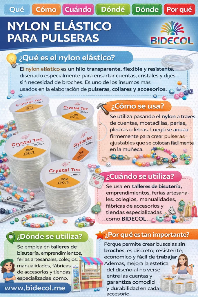 El nylon elástico es un hilo transparente, flexible y resistente, diseñado especialmente para ensartar cuentas, cristales y dijes sin necesidad de broches. Es uno de los insumos más usados en la elaboración de pulseras, collares y accesorios artesanales.