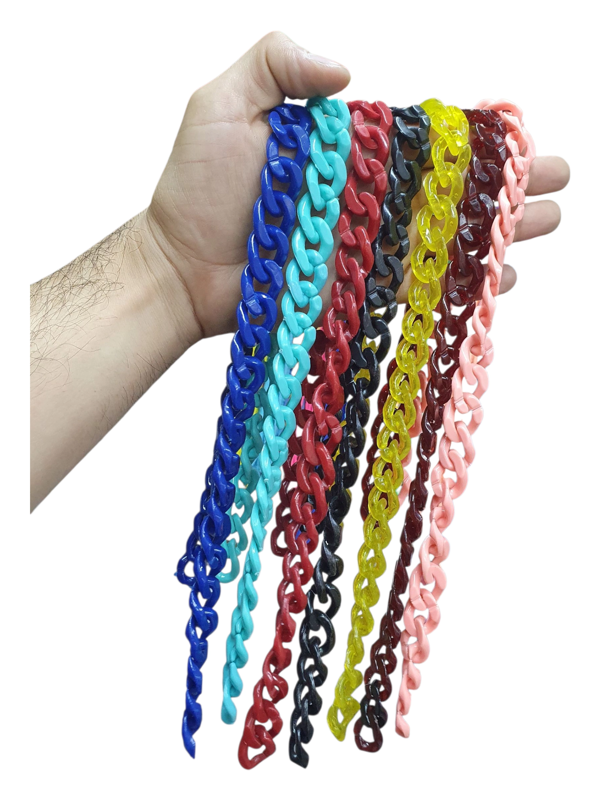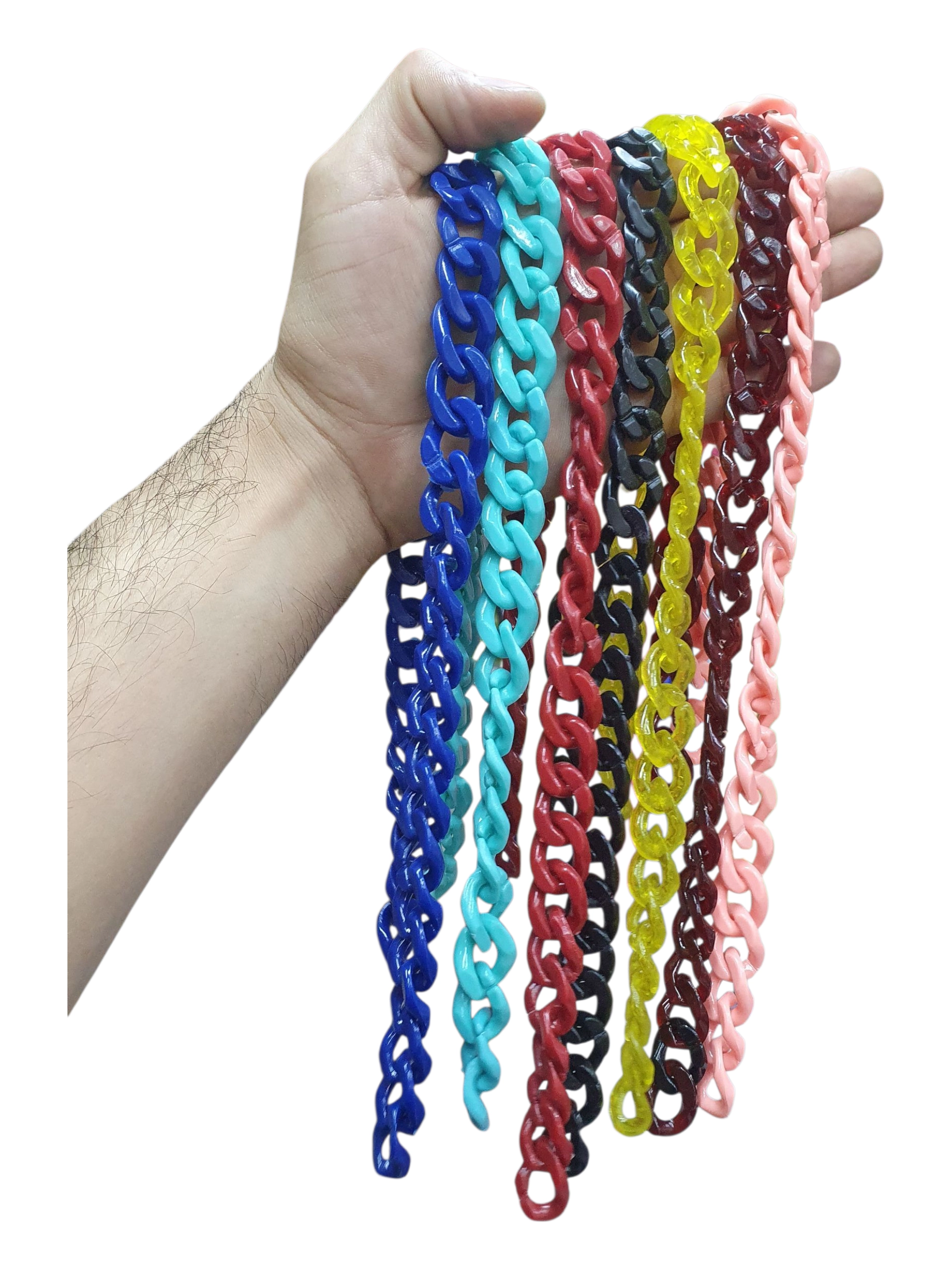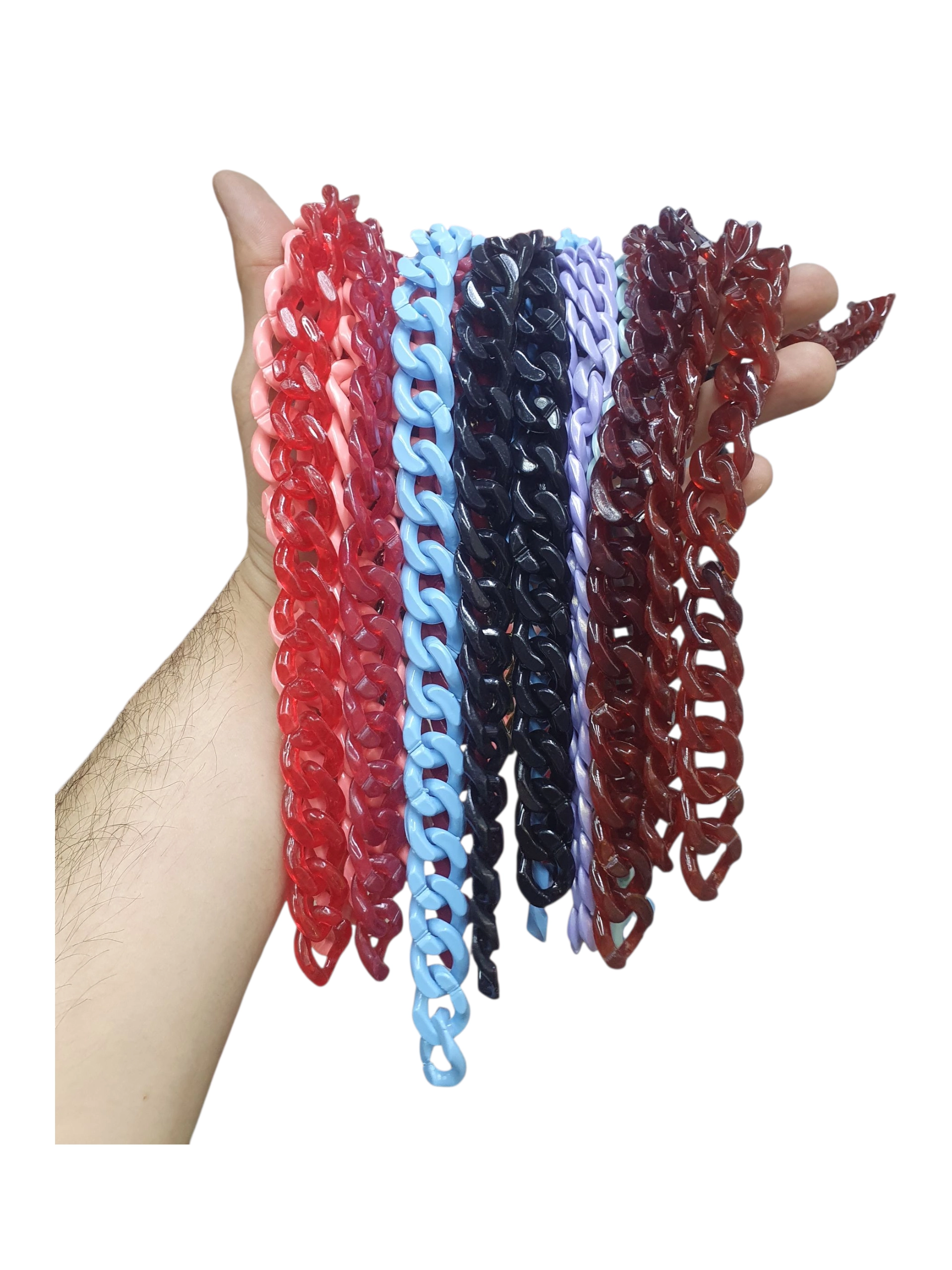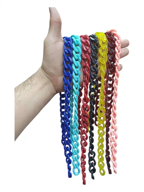 Venta de cadenas acrílicas para bisuteria y manualidades, cadenas para elaboración de accesorios, llaveros y manualidades en general. Los eslabones de la cadena tienen muesca abierta por la cual se pueden adherir o separar de forma fácil. Cadena plástica.