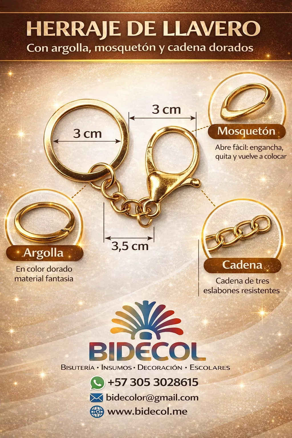 Los herrajes para llaveros son piezas metálicas esenciales en bisutería y manualidades porque permiten convertir cualquier creación en un accesorio funcional, resistente y con acabado profesional, ya que integran argollas, mosquetones y pequeñas cadenas donde se fijan dijes, mostacillas o figuras; se usan cuando se quiere transformar un diseño artesanal en un llavero listo para vender, regalar o personalizar, y son ideales para bolsos, mochilas, souvenirs, detalles corporativos y emprendimientos creativos, aportando no solo seguridad y durabilidad sino también estética, valor y practicidad, convirtiendo cada pieza en un producto atractivo y comercial.