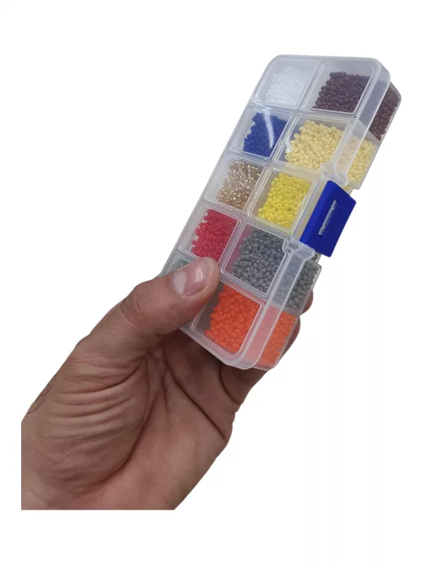 Presentación: caja organizadora con 100 gramos de mostacilla, 10 colores variados diferentes