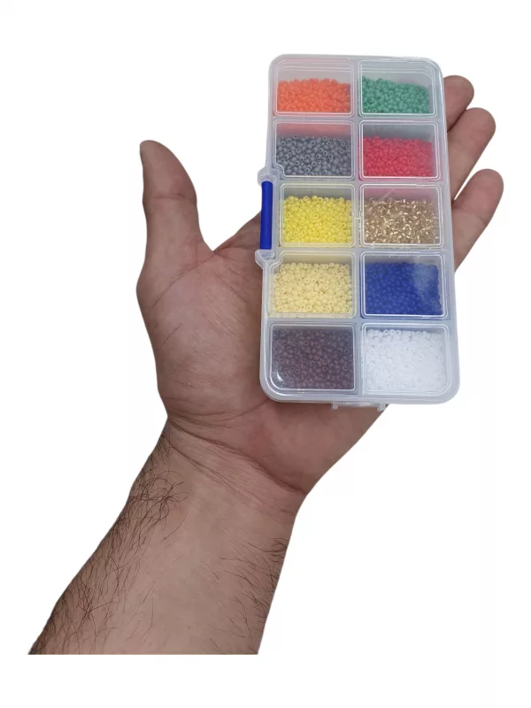 Presentación: caja organizadora con 100 gramos de mostacilla, 10 colores variados diferentes