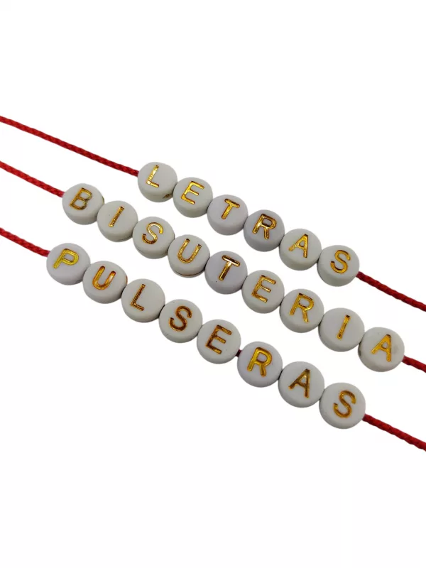 Letras para pulseras y bisuteria, base circular blanca y letra dorada, letra pasante para manillas y pulseras. 100 gramos