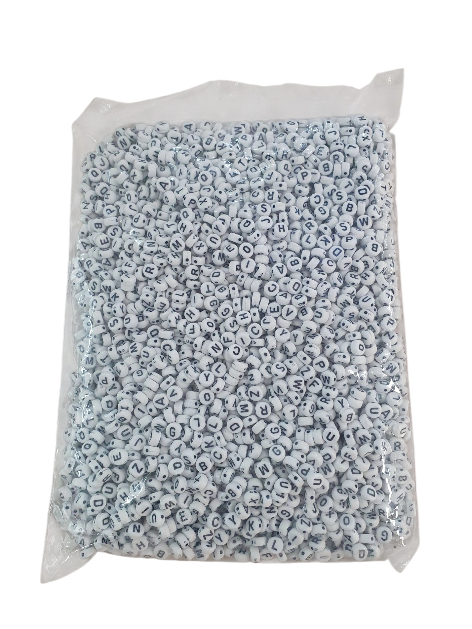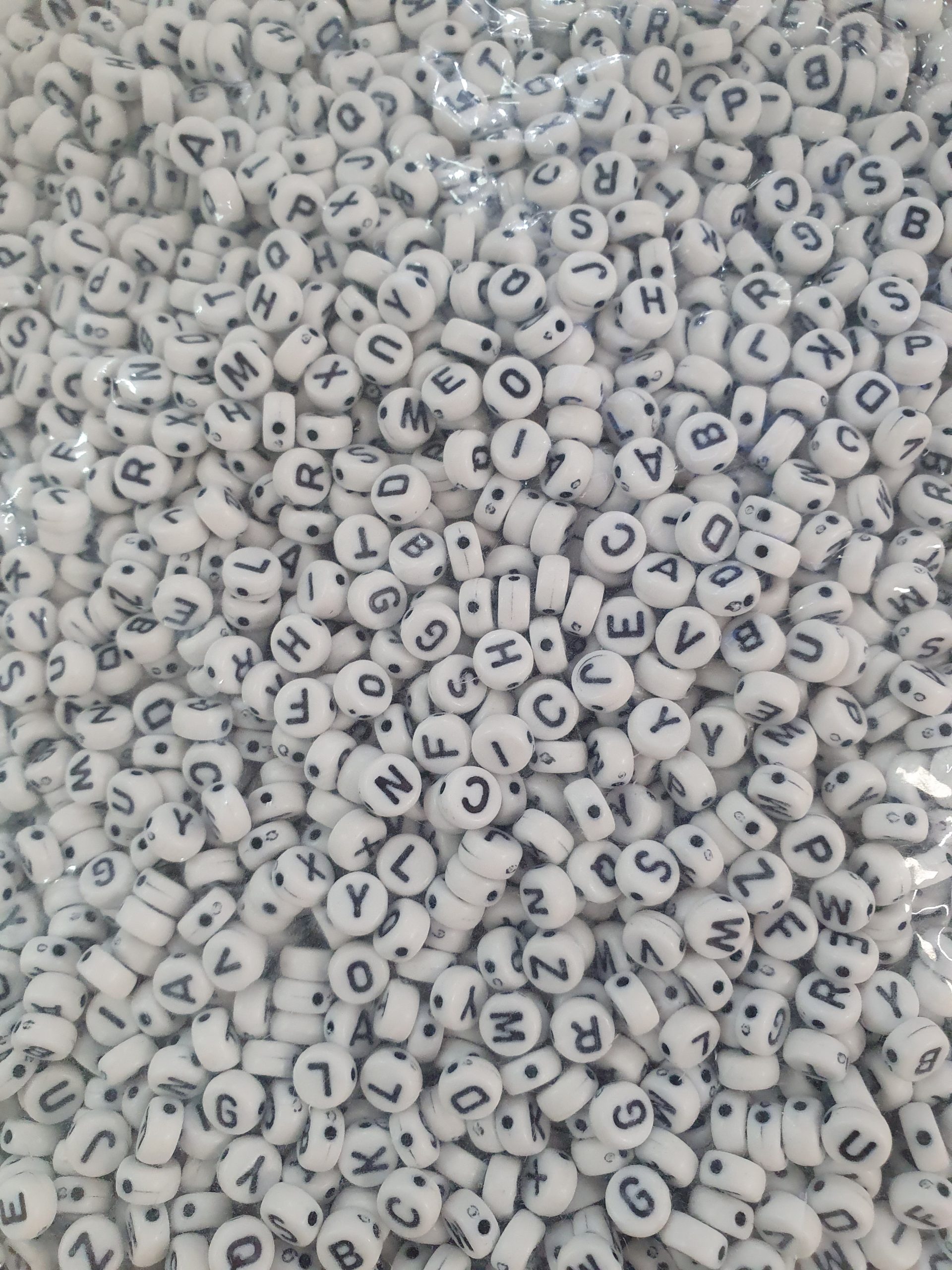 Venta de libras de letras acrílicas para elaboración de pulseras, manillas y manualidades, entre otros Color y referencia de la imagen principal Letras de calibre 6 mm diametro x 2,5 mm de calibre, mas de 2.800 letras por cada libra 500 Gr, 500 gramos de contenido, letras con perforación horizontal