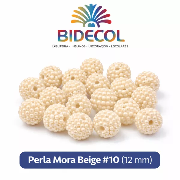 La perla mora o perla agrupada es un insumo para bisutería fabricado en material sintético moldeado de alta uniformidad. Se caracteriza por su estructura agrupada tipo racimo, superficie lisa con acabado perlado brillante y perforación central precisa que facilita el ensartado manual o industrial.