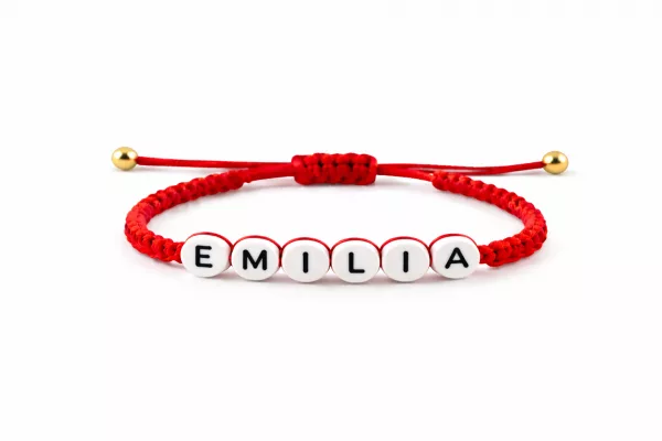 Esta pulsera femenina tejida en nudo plano de macramé está elaborada artesanalmente con hilo rojo de alta resistencia, ideal para uso diario. Es una pulsera personalizada con nombre femenino, diseñada con letras tipo pastilla circular de 6 mm aproximadamente, fondo blanco y letra negra, que ofrecen una excelente legibilidad y un acabado elegante.