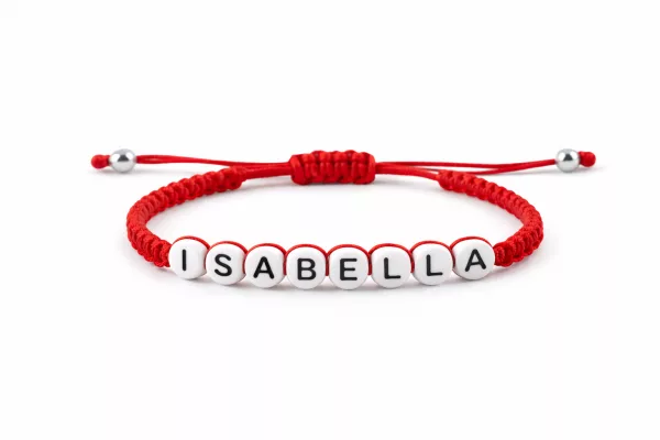 Esta pulsera femenina tejida en nudo plano de macramé está elaborada artesanalmente con hilo rojo de alta resistencia, ideal para uso diario. Es una pulsera personalizada con nombre femenino, diseñada con letras tipo pastilla circular de 6 mm aproximadamente, fondo blanco y letra negra, que ofrecen una excelente legibilidad y un acabado elegante.