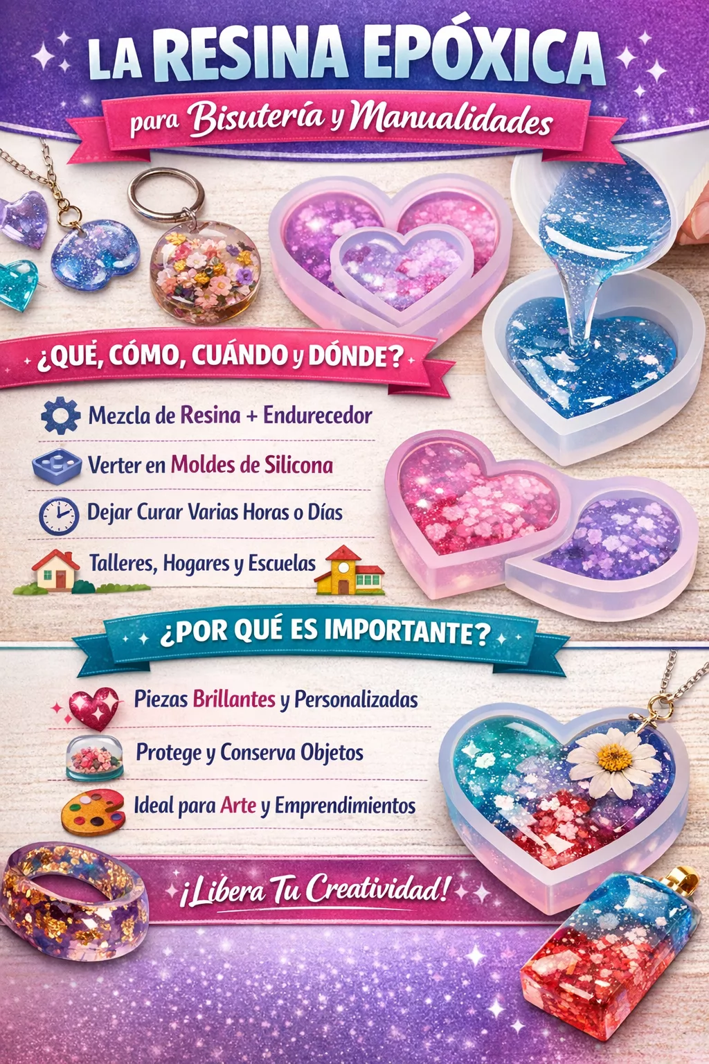 La resina epóxica es un material líquido de dos componentes (resina y endurecedor) que, al mezclarse, se solidifica formando un acabado transparente, brillante y resistente, ideal para bisutería y manualidades. Se utiliza mezclando ambos componentes en proporciones exactas, vertiéndolos en moldes de silicona o sobre piezas decorativas, y dejándolos curar por varias horas o días. Se emplea cuando se desean crear piezas personalizadas, encapsular flores, chaquiras, letras o pequeños objetos, y se trabaja principalmente en talleres, hogares, colegios y espacios creativos, ya que no requiere maquinaria compleja.